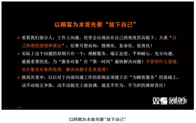 李二橋分享到,在座的各位首先要認知到誰(shuí)是你的服務(wù)對象,在認清服務(wù)對象之后,再遵循“以顧客為本”的核心價(jià)值觀(guān),在第一時(shí)間為服務(wù)對象解決問(wèn)題。