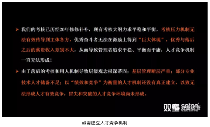近兩天的改革,激發(fā)出了大家思維的活躍性,但改革不是短期的事情,要讓思維活躍性得到持續,就需要建立起組織榮辱觀(guān),通過(guò)全方位多渠道的文化宣傳,讓所有人感受到壓力,讓所有人參與其中,激發(fā)全體員工的積極性和能動(dòng)性。