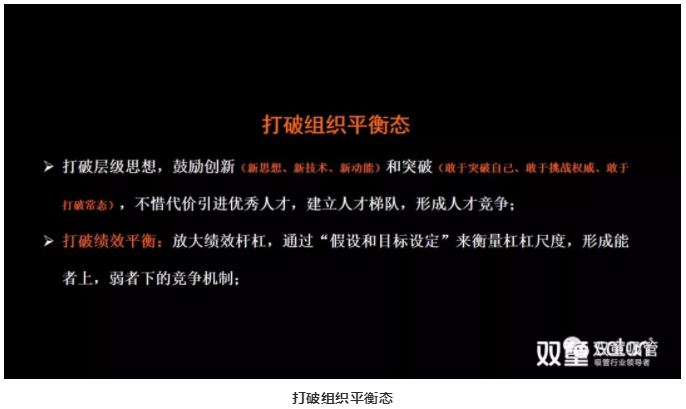 打破層級思想,鼓勵創(chuàng )新(新思想、新技術(shù)、新動(dòng)能)和突破(敢于突破自己、敢于挑戰權威、敢于打破常態(tài)),不惜代價(jià)引進(jìn)優(yōu)秀人才,建立人才梯隊,形成人才競爭; 打破績(jì)效平衡:放大績(jì)效桿杠,通過(guò)“假設和目標設定”來(lái)衡量杠杠尺度,形成能者上,弱者下的競爭機制;
