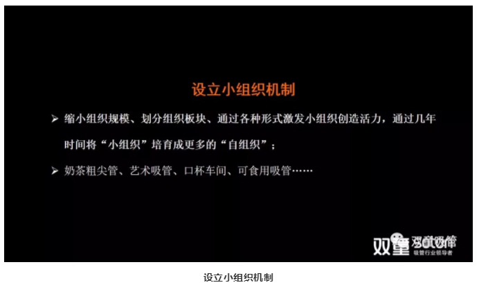 縮小組織規模、劃分組織板塊、通過(guò)各種形式激發(fā)小組織創(chuàng )造活力,通過(guò)幾年時(shí)間將“小組織”培育成更多的“自組織”。