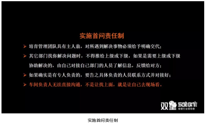 培育管理團隊具有主人翁,對所遇到解決事物必須給予明確交代; 其它部門(mén)找你解決問(wèn)題時(shí),不得推給上級或下級,如果是需要上級或下級協(xié)助解決的,由自己對接自己部門(mén)的人員了解信息,反饋給對方; 如果確實(shí)是有專(zhuān)人負責的,要告之具體負責的人員聯(lián)系方式并對接好;車(chē)間負責人無(wú)法直接溝通,不是讓找上面,就是讓自己去現場(chǎng)看。