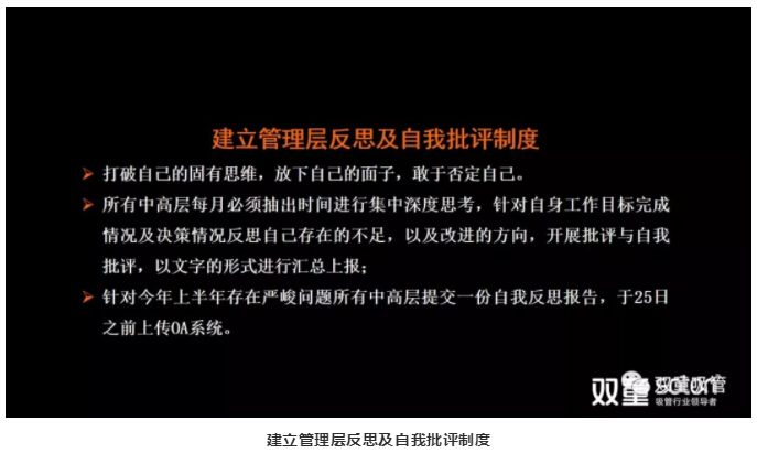 打破自己的固有思維,放下自己的面子,敢于否定自己。 所有中高層每月必須抽出時(shí)間進(jìn)行集中深度思考,針對自身工作目標完成情況及決策情況反思自己存在的不足,以及改進(jìn)的方向,開(kāi)展批評與自我批評,以文字的形式進(jìn)行匯總上報; 針對今年上半年存在嚴峻問(wèn)題所有中高層提交一份自我反思報告,于25日之前上傳OA系統。