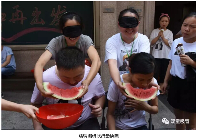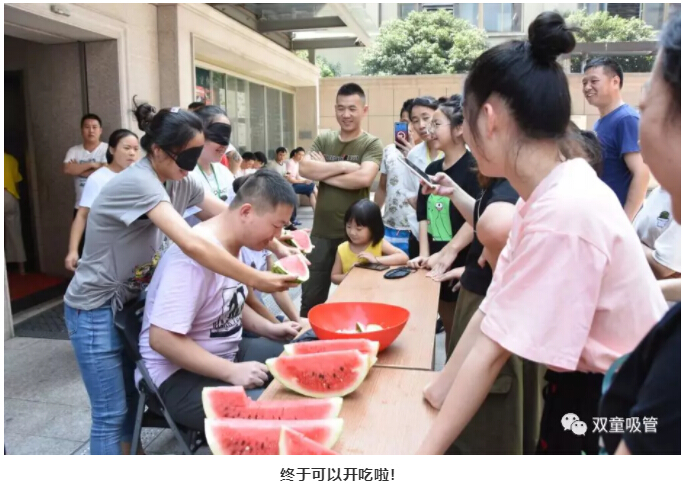 游戲的第一項就是“蒙眼吃西瓜”!聽(tīng)到吃,大家的眼睛都亮了,笑說(shuō):吃西瓜,太簡(jiǎn)單了!真的像大家說(shuō)的很簡(jiǎn)單嗎?快跟著(zhù)妞來(lái)看看吧!