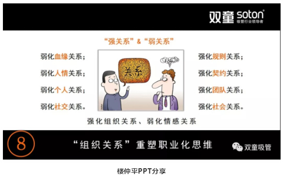 樓仲平則十分注重關(guān)系哲學(xué),他認為一個(gè)人的能力是有限的,能發(fā)展的強關(guān)系范圍也就只有十來(lái)個(gè)人,在企業(yè)經(jīng)營(yíng)中,十多個(gè)人的作用并不大!在企業(yè)內部要弱化血緣關(guān)系,強化規則關(guān)系;弱化人情關(guān)系,強化契約關(guān)系;弱化個(gè)人關(guān)系,強化團隊關(guān)系;弱化社交關(guān)系,強化社會(huì )關(guān)系。