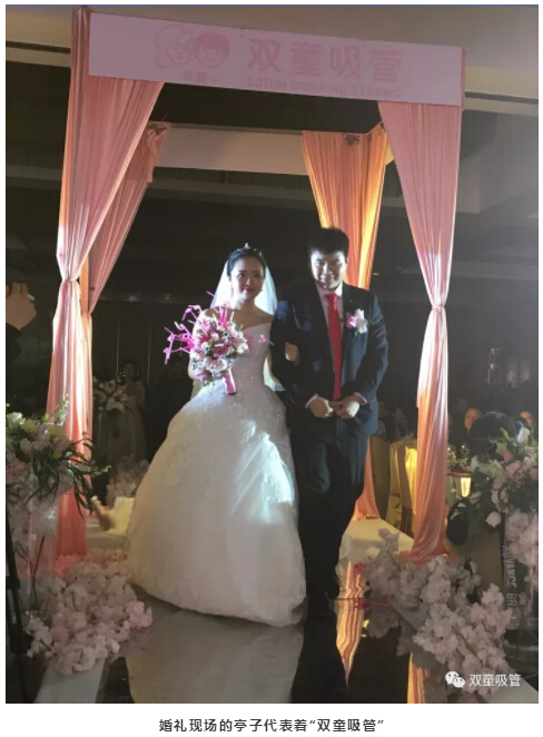 婚禮現場(chǎng)也是滿(mǎn)滿(mǎn)的“雙童”元素。婚禮現場(chǎng)的亭子就代表著(zhù)“雙童吸管”,吸管妞手里的捧花,也是由一根根愛(ài)心吸管組成的,洋溢著(zhù)滿(mǎn)滿(mǎn)的愛(ài)意!