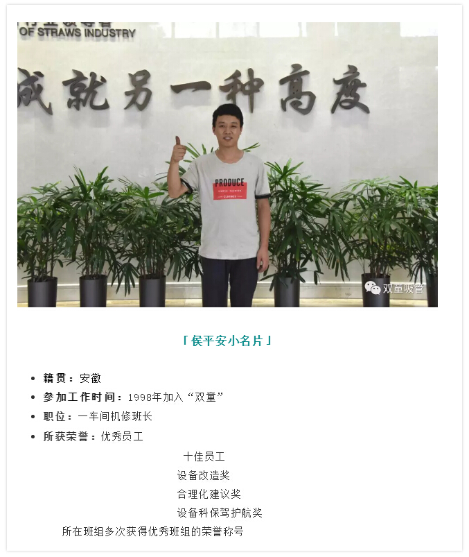 踏實(shí)肯干,敢于嘗試,勇于探索……今天,吸管妞要帶大家認識的主人公是一位忠誠追隨“雙童”二十多年的老員工侯平安,講述他從18歲小伙成長(cháng)為如今獨當一面車(chē)間班組長(cháng)的精彩故事!