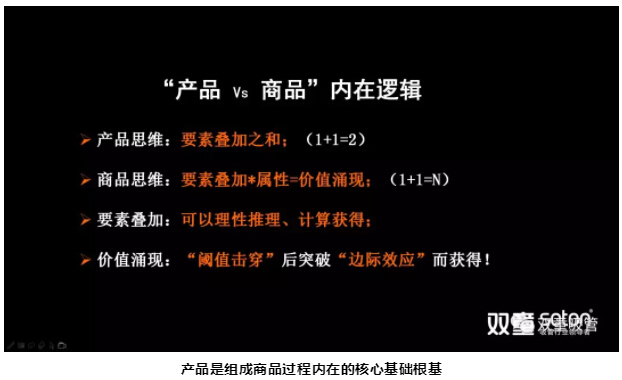 產(chǎn)品本身只是要素疊加之和,如:1+1=2。但商品是在產(chǎn)品之外不斷疊加常人難以看見(jiàn)的內在屬性,我們可以通過(guò)“要素拆解”看到這些屬性,如產(chǎn)品的質(zhì)量、標準、創(chuàng )意性,文化性等,從而讓產(chǎn)品內在的屬性不斷外延,改變產(chǎn)品的要素成本疊加從1+1=2,逐漸轉變?yōu)?+1=N,繼而實(shí)現產(chǎn)品內在價(jià)值的全面提升。