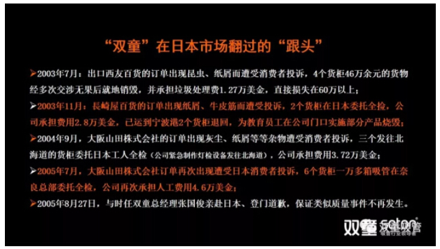 但廁所改善了,重大質(zhì)量事故卻還在不斷發(fā)生!前前后后七八年的時(shí)間里,“雙童”在日本市場(chǎng)栽了不少“跟頭”,虧損了大量資金,在這樣的情況下到底選擇“死磕”還是“放棄”?