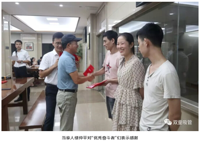 9月9日晚,“雙童”召開(kāi)了關(guān)于8月21日—8月31日階段性競賽獎勵表彰大會(huì )!會(huì )上,當家人樓仲平再次為所有員工站臺,兌現了讓每位“優(yōu)秀奮斗者”獲得更高獎金的承諾。同時(shí),樓仲平表示每個(gè)月都將與員工站在一起,并鼓勵和推動(dòng)所有員工“以?shī)^斗者為本”,與“雙童”共同成長(cháng)!
