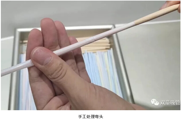 但這樣的吸管還不能正常的彎曲,還需要將一根竹筷子從吸管前端穿入,把折彎波紋處回縮,才形成了一根能正常使用的可彎曲吸管。