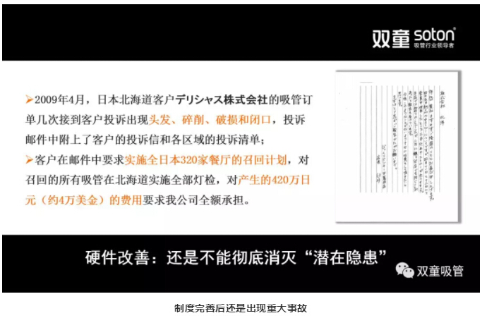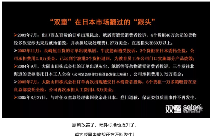 但廁所改善了,生產(chǎn)環(huán)境優(yōu)化了,硬件標準也提升了,重大質(zhì)量事故卻還在不斷發(fā)生!前前后后七八年的時(shí)間里,“雙童”在日本市場(chǎng)栽了不少“跟頭”,虧損了大量資金,在這樣的情況下,選擇“死磕”還是“放棄”?