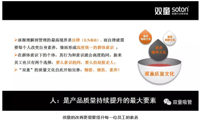 通過(guò)對環(huán)境和制度的不斷改善,我們認知到:質(zhì)量的改善僅有硬件和制度是不夠的,更需要不斷提升每一位員工的素養,形成高度統一的群體意識 。自此,“雙童”質(zhì)量文化開(kāi)始逐步完善,通過(guò)硬件環(huán)境和文化氛圍潛移默化地影響員工,用精細化管理的方式改變員工的意識和習慣。
