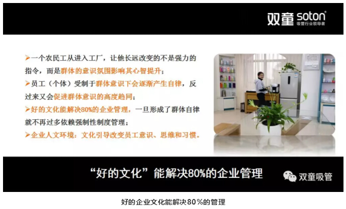 “雙童”在質(zhì)量體系的建設前后花費了十多年的時(shí)間,同時(shí)在日本市場(chǎng)的倒逼下,不惜代價(jià),死磕到底,最終敲開(kāi)了日本市場(chǎng)的大門(mén),徹底占領(lǐng)日本和歐盟市場(chǎng)。這十多年里,“雙童”也逐漸認識到好的企業(yè)文化能解決80%的管理,只有“精致的文化”才能生產(chǎn)出精致的產(chǎn)品!