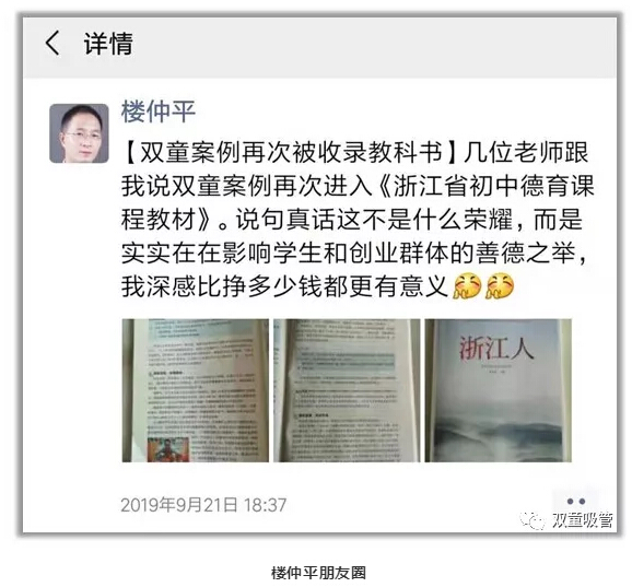 號外!號外!“雙童”案例再次被收錄教科書(shū)!近日,幾位老師告訴當家人樓仲平,“雙童”案例出現在浙江省初中德育課程教材《浙江人》當中,樓仲平也第一時(shí)間在朋友圈中分享了這個(gè)好消息,并感言:這比掙多少錢(qián)都有意義!