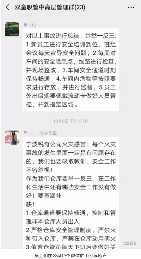 與此同時(shí),針對此次寧波火災的重大事件,“雙童”人也結合企業(yè)內部的安全工作寫(xiě)下了安全感言,從而形成安全生產(chǎn)的高壓線(xiàn)!