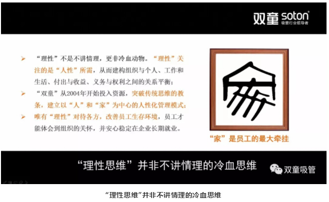 另一方面,公司建立了以“人”和“家”為中心的人性化管理模式。很多員工的家屬和小孩成群結隊地在食堂吃飯,并生活在企業(yè)內部。同時(shí),“雙童”又一直引導員工“公司不是我的家”,理解“責、權、利”平衡下的奉獻關(guān)系,關(guān)注“人性”所需并給予員工必要關(guān)愛(ài),從而達到組織與個(gè)人之間的關(guān)系平衡。