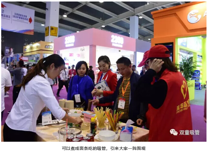 “雙童”可食用淀粉吸管在義博會(huì )上閃亮登場(chǎng),成為了展會(huì )上的“大明星”,一瞬間就勾起了來(lái)往客商滿(mǎn)滿(mǎn)的好奇心,紛紛駐足洽談,“雙童”展位都快擠“爆”了!