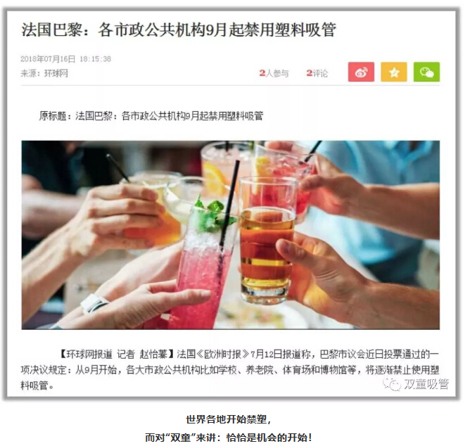 由于塑料吸管難以反復利用,隨之而產(chǎn)生的白色污染給環(huán)境帶來(lái)了巨大的傷害,引發(fā)了越來(lái)越多人的關(guān)注!近年來(lái),全球多地政府掀起“限塑”熱潮,至此,“雙童”意識到:塑料產(chǎn)業(yè)面臨徹底顛覆,吸管產(chǎn)品的行業(yè)革命已經(jīng)來(lái)襲!