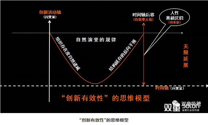 通過(guò)宇宙演化、生物進(jìn)化等自然規律的演繹,我們能夠認知到創(chuàng )新是“喜新厭舊”的應變反饋。這就說(shuō)明了:創(chuàng )新有“時(shí)間軸”,隨著(zhù)“時(shí)間軸”不斷后移,原有的“創(chuàng )新”開(kāi)始失效,最后變成了無(wú)效,創(chuàng )新活動(dòng)也就“無(wú)窮無(wú)盡”!