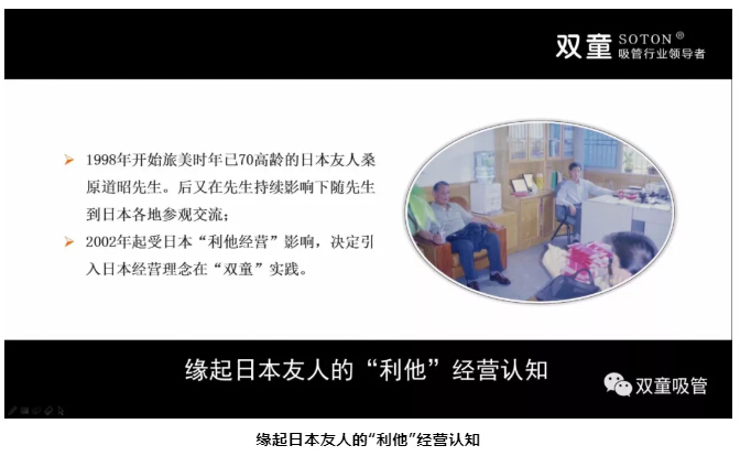 1998年,“雙童”樓仲平結識了一位旅美日本友人桑原道昭先生。桑原道昭先生在美國待了45年,會(huì )一點(diǎn)漢語(yǔ)。他會(huì )和樓仲平交流做生意的看法,并用日本人的視角和思想解讀節能環(huán)保、節約土地、員工關(guān)懷等方面的話(huà)題。