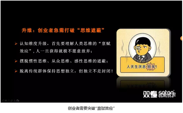 明白了何為“稟賦效應”以后,我們就不難理解,樓仲平為何會(huì )在課程中一再強調,創(chuàng )業(yè)者需要打破慣性思維、從眾思維、感性思維的“思維遮蔽”,突破“稟賦效應”,脫離傳統群體保持思想獨立,從而實(shí)現認知升維!