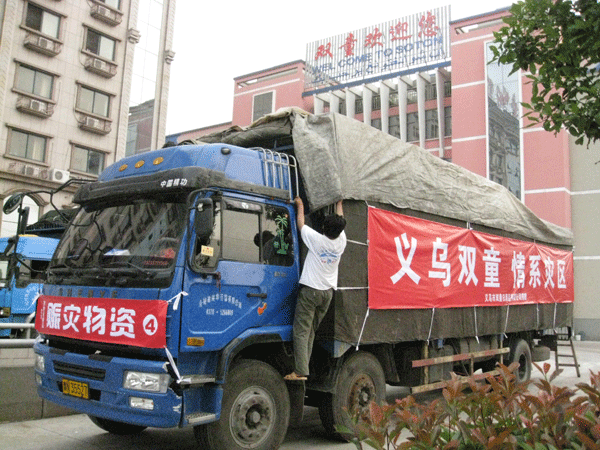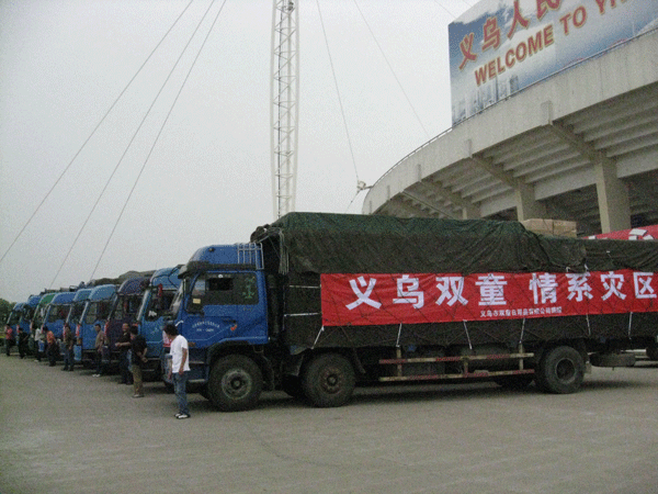 5.12汶川大地震,牽動(dòng)著(zhù)義烏人民的心尖,抗震救災,義不容辭。2008年5月30日,在得知綿陽(yáng)災區急需生活用品的消息后,第一時(shí)間內由9家生產(chǎn)日用品的義烏企業(yè)主自發(fā)組織了賑災活動(dòng),其中義烏市雙童日用品有限公司、義烏市佳潔塑膠有限公司、義烏市安柔為衛生用品有限公司、浙江康泰塑業(yè)有限公司、義烏利津日用品有限公司、義烏圣象塑料制品有限公司、義烏市春香日用品廠(chǎng)、義烏市好易日用品有限公司、義烏市一帆日用品有限公司共計物資達136萬(wàn)元,包括塑料杯5100箱、大號垃圾桶1500箱、衛生巾400箱、嬰兒尿褲400箱,由義烏梅湖體育館出發(fā),分10車(chē)直接發(fā)送四川災區。