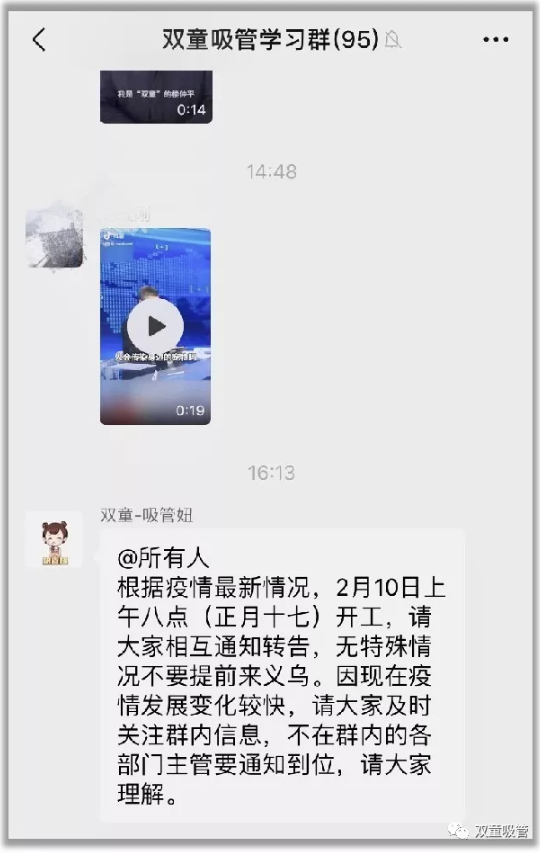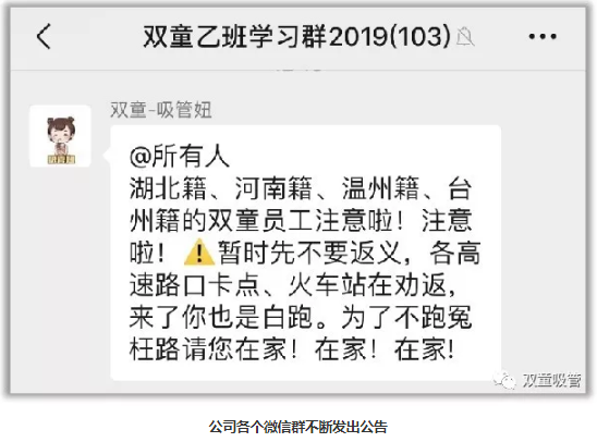 “雙童”微信群不斷發(fā)出公告,提醒所有員工延返義烏,何時(shí)回公司上班根據疫情控制而定,對于湖北籍員工,在家期間工資照發(fā),一分不扣,給員工們吃下了定心丸。