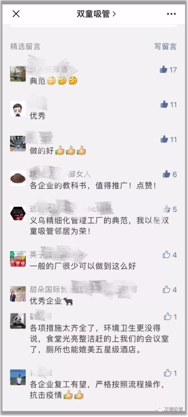 此篇文章發(fā)布后不僅引發(fā)了社會(huì )極大關(guān)注,很多企業(yè)也紛紛聯(lián)系吸管妞想借鑒“雙童”的復工文件進(jìn)行參考?;诟鞔笃髽I(yè)的需求,“雙童”復工防疫流程文件包將對企業(yè)進(jìn)行免費分享!快添加吸管妞微信免費領(lǐng)取吧!