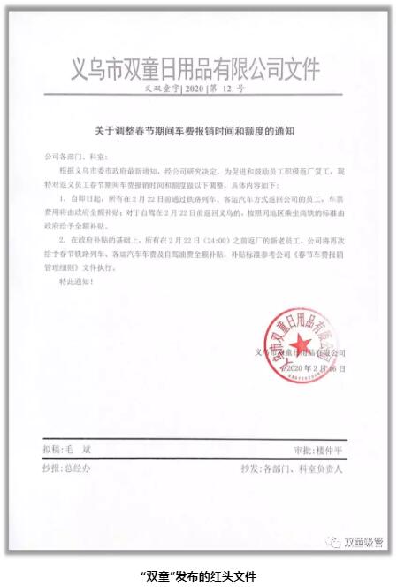 “雙童”作為義烏第一批復工企業(yè),早已建立企業(yè)防疫復工的工作流程體系,并成為復工防疫的模范企業(yè)。
