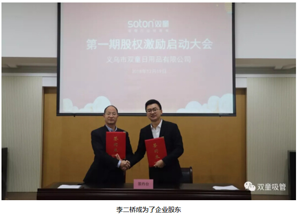 2001年9月,李二橋經(jīng)哥哥介紹成為了“雙童”的一名“理管工”。他從理管工開(kāi)始努力,厚積薄發(fā),先后任職車(chē)間統計員、車(chē)間班組長(cháng)、品管部主任、總經(jīng)理助理、總經(jīng)理等崗位。2018年12月,他在股權激勵大會(huì )上接過(guò)了股權激勵證書(shū),晉升為公司股東,完成了從打工仔到“義烏勵志哥”的完美蛻變!