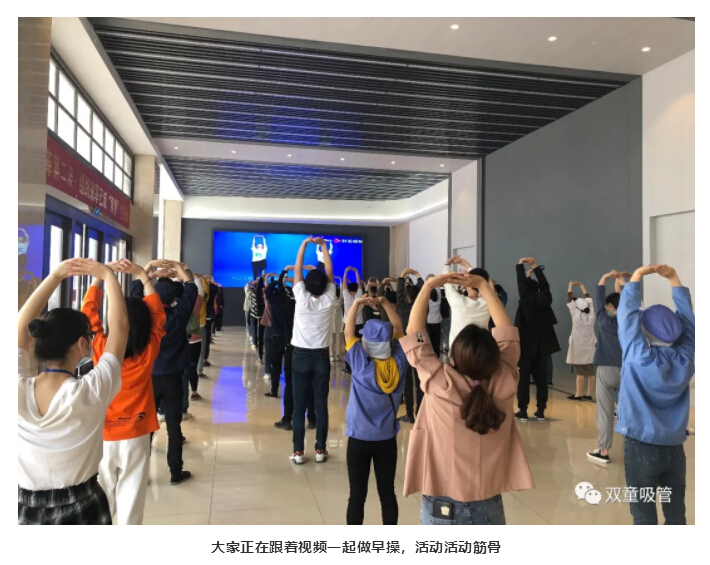 俗話(huà)說(shuō):“一日之計在于晨,一周之計在于首!”工作雖然很重要,但是我們的身體素質(zhì)也非常重要!因此,每周一在“雙童”新廠(chǎng)區大廳,員工們列隊整齊,精神飽滿(mǎn),氣宇軒昂,伴著(zhù)豪邁的音樂(lè ),用整齊劃一的動(dòng)作做起早操,形成了一道靚麗的風(fēng)景線(xiàn)。