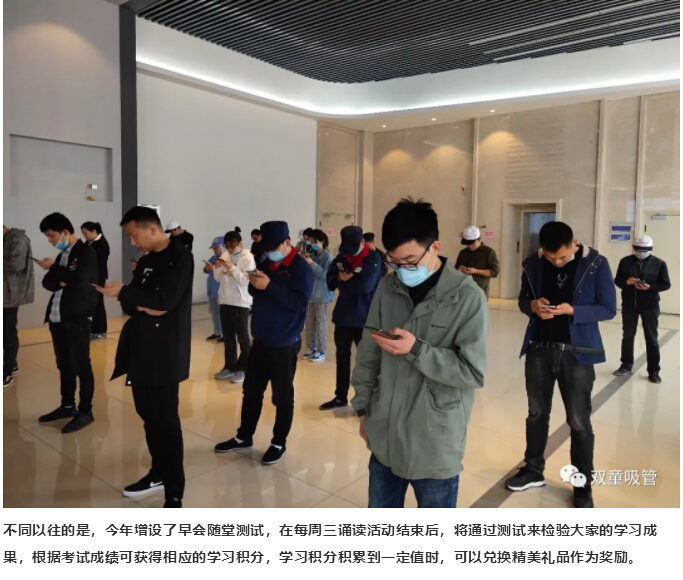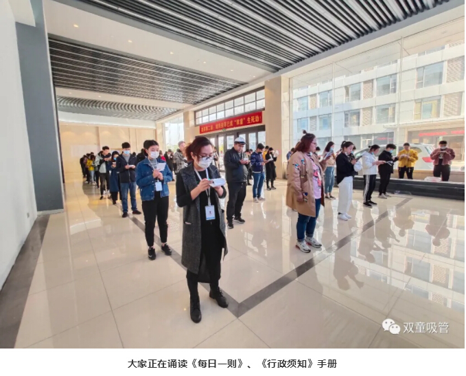 在此期間,大家一同誦讀《每日一則》,《行政須知》手冊等企業(yè)文化內容,俗語(yǔ)說(shuō):“書(shū)讀百遍,其義自見(jiàn)”,通過(guò)誦讀活動(dòng),將“雙童”的企業(yè)文化灌輸給員工們,根植于員工內心深處,潛移默化地改變員工的思維認知!