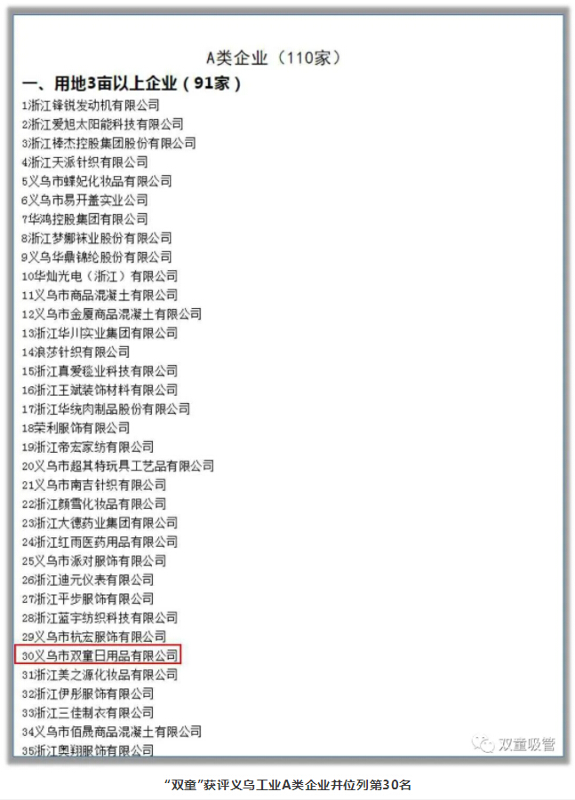 近期,義烏工業(yè)企業(yè)“畝均論英雄”評價(jià)結果已出爐。“雙童”在義烏2094家工業(yè)企業(yè)中獲評A類(lèi)企業(yè),并取得了前所未有的好成績(jì),從2018年的第62名直線(xiàn)晉升到2019年的第30名!
