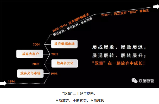 2003年,“雙童”放棄了多元經(jīng)營(yíng),放棄了低價(jià)貼牌加工的“大客戶(hù)”,提出了“兩條腿走路”和“小客戶(hù)原則”;