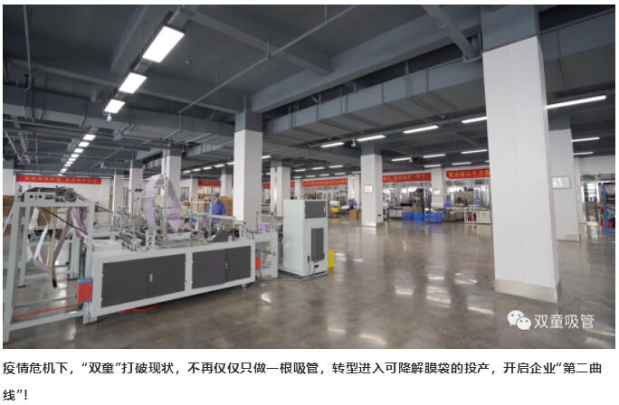 面對此次疫情危機對“雙童”帶來(lái)的巨大影響和挑戰,“雙童”在堅守實(shí)業(yè)的同時(shí)選擇擁抱變化,突破固有思維,不再僅僅只做一根吸管,堅持發(fā)展企業(yè)“第二曲線(xiàn)”轉型投產(chǎn)于生物質(zhì)可降解膜袋!