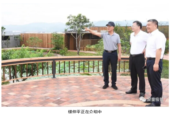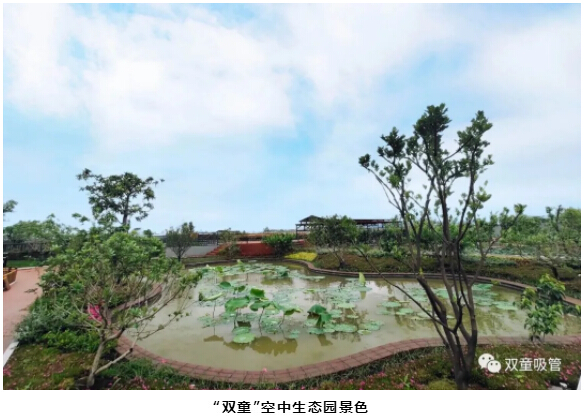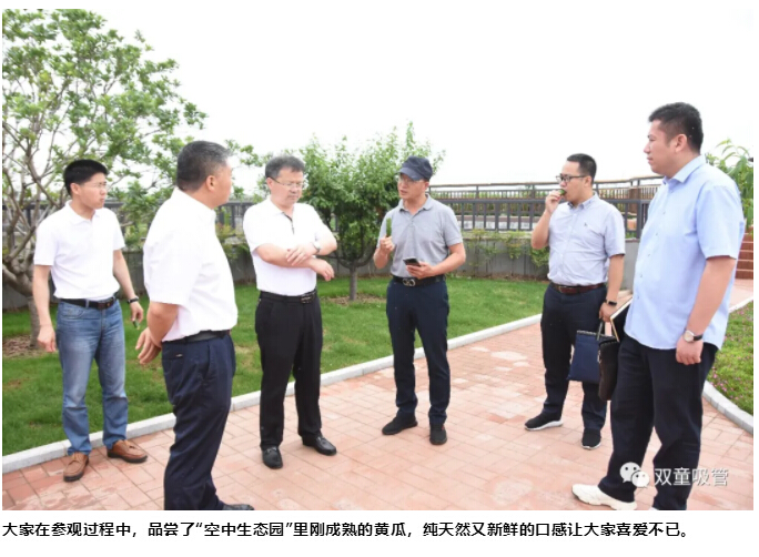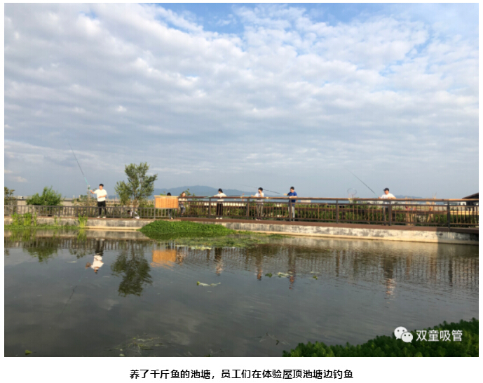 最后,樓仲平陪同李中文社長(cháng)一行來(lái)到“雙童”新廠(chǎng)房的“空中生態(tài)園”,樓仲平介紹道:“這里栽種了200多棵果樹(shù),還有各種蔬菜基地、藕塘、百花苑、還有養了千斤魚(yú)的池塘、標準的籃球場(chǎng)......