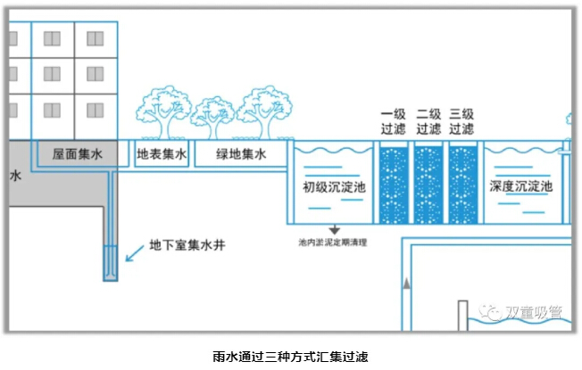 秘訣就是在屋頂、路面、綠化帶中做好雨水收集點(diǎn),用地下管道把它們連成一個(gè)整體,經(jīng)過(guò)科學(xué)過(guò)濾,匯集到一個(gè)總裝水容量2000多噸的雨水收集池。