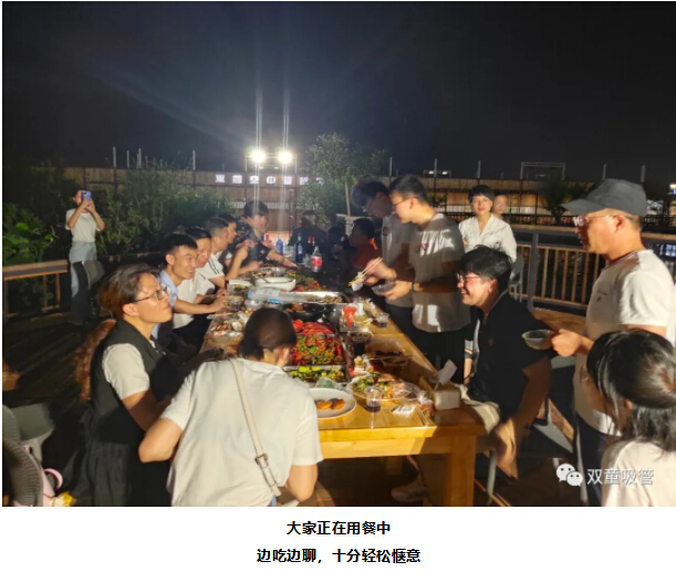 此次活動(dòng)的晚餐安排在“雙童”空中生態(tài)園,隨著(zhù)夜幕降臨,濃濃夜色給就餐氛圍添加了一絲浪漫,伴隨著(zhù)夜幕下的美景,大家邊吃邊聊,相處甚是融洽!