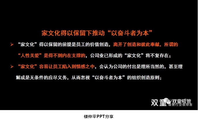 因此,樓仲平引導大家認知:“雙童”是所有員工以創(chuàng )造價(jià)值獲得生存為最高追求的平臺,而不是休閑和養老的地方。所以,“雙童”在倡導家文化的同時(shí),提出了“雙童不是我的家”觀(guān)點(diǎn),提倡“以?shī)^斗者為本”,希望以此來(lái)提升組織效率!