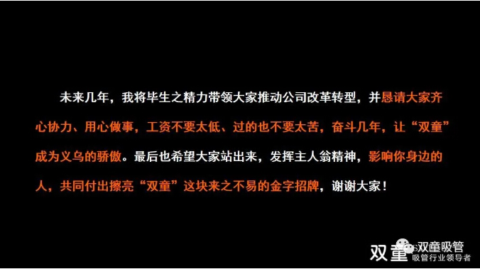 最后,樓仲平鄭重和大家承諾:未來(lái)幾年 ,我將帶領(lǐng)大家推動(dòng)公司改革轉型,希望大家齊心協(xié)力,用心做事,從而讓大家在付出血汗后,工資不會(huì )太低,過(guò)的不會(huì )太苦,少受委屈,獲得尊重。我會(huì )盡心盡力鼓勵你們,推動(dòng)你們,助長(cháng)你們,我們共同來(lái)支撐“雙童”走向未來(lái)!