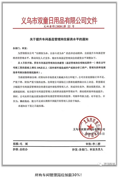 4月3日,“雙童”給所有生產(chǎn)一線(xiàn)管理人員逆勢加薪30%。消息一出,引起社會(huì )很大反響。為什么要這樣做?因為在疫情之下,大量企業(yè)停產(chǎn),大量的管理人員處在流動(dòng)之中,我們意識到這是一次很好的吸納人才的機會(huì ),進(jìn)而為企業(yè)未來(lái)的發(fā)展注入了新的活力。