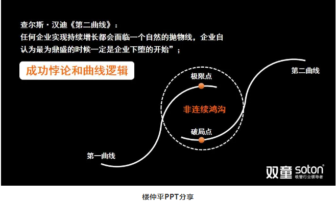 首先,樓仲平引用查爾斯·漢迪《第二曲線(xiàn)》:“任何企業(yè)實(shí)現持續增長(cháng)都會(huì )面臨一個(gè)自然的拋物線(xiàn),企業(yè)自認為最為鼎盛的時(shí)候一定是企業(yè)下墮的開(kāi)始”!
