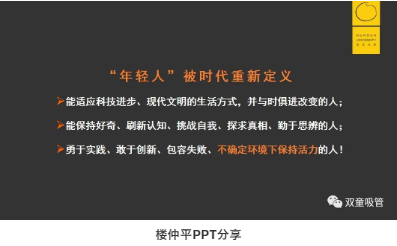 他認為:“年輕人”是這個(gè)時(shí)代的主人。他們更能接受新的變化,更能理解新鮮事物,更能獲得新的機遇。50后、60后、70后們只能更努力地向年輕人靠攏,向年輕人學(xué)習,才不會(huì )被這個(gè)時(shí)代所拋棄,才能在不確定的時(shí)代下保持活力!