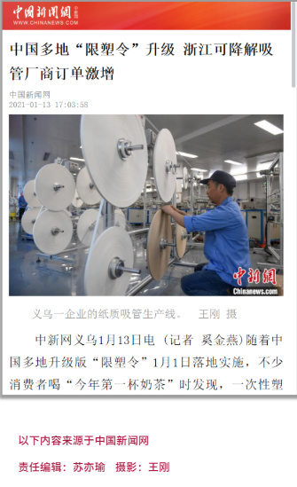 1月13日,中國新聞網(wǎng)刊登了一篇關(guān)于“雙童吸管”報道。在“禁塑令”升級廣泛推行之際,“雙童”環(huán)保吸管受到社會(huì )各界廣泛的關(guān)注。下面就跟著(zhù)吸管妞一起去看看吧!