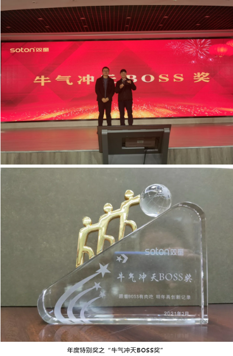 2020年是疫情突發(fā)年,我們的產(chǎn)值也受到了前所未有的挑戰,國外貿易大幅下降,幸而國內貿易在今年異軍突起。在此,我對“雙童”所有員工表示感謝。馬上2021年迎面向我們走來(lái),而2021年又是充滿(mǎn)機會(huì )和挑戰的一年,我們面前只有一條路:做好自己、迎接挑戰、創(chuàng )造未來(lái)!除了給優(yōu)秀奮斗者頒發(fā)了獎項之外,“雙童”全體員工還為我們的Boss——樓仲平準備了一個(gè)驚喜!到底是什么驚喜呢?戳視頻一起來(lái)看看:最后,總經(jīng)理李二橋現場(chǎng)為樓總頒發(fā)了“牛氣沖天BOSS獎”!愿公司在兩位Boss的帶領(lǐng)下,“雙童”在2021年度能夠能蒸蒸日上,越來(lái)越好!