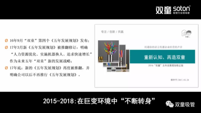 但在2015年以后,在持續增長(cháng)受限的現實(shí)情況下,我們逐漸意識到原先堅持的“做減法”模式已經(jīng)慢慢成為了企業(yè)發(fā)展的瓶頸。- 2016年9月“雙童”第三個(gè)《五年發(fā)展規劃》發(fā)布。但在發(fā)布以后,我們也發(fā)現在巨變時(shí)代下,短短幾個(gè)月時(shí)間內外部環(huán)境就會(huì )產(chǎn)生巨大變化,企業(yè)經(jīng)營(yíng)往往“計劃趕不上變化”;
