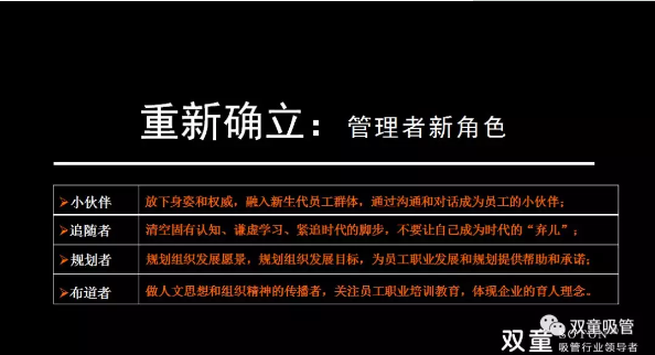 面對不同的員工群體,尤其是個(gè)性鮮明的90后、00后員工。作為管理者,首先需要改變的就是傳統的管理者角色,重新轉變、扮演四個(gè)新角色: