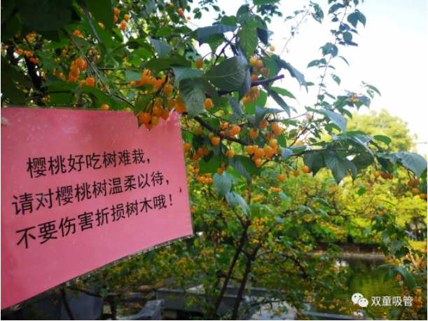 咦?櫻桃樹(shù)上除了有櫻桃,還有一塊牌子呢!原來(lái),為了讓櫻桃樹(shù)更好的生長(cháng),“雙童人”在每棵櫻桃樹(shù)上都掛了標語(yǔ)牌,提醒大家在摘櫻桃時(shí)不要折損傷害櫻桃樹(shù)。