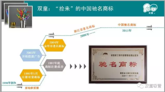 “雙童吸管”從1995年開(kāi)始的品牌塑造,基本是五年一個(gè)階段,前五年基本沒(méi)有聲音,屬于積累期;第二個(gè)五年的2000年獲“義烏名牌”,2003年獲“金華市著(zhù)名商標”和“金華名牌”。第三個(gè)五年從2005年之后分別獲“浙江省著(zhù)名商標”、“浙江省名牌產(chǎn)品”、“浙江省知名商號”和“浙江省綠色企業(yè)”等省級榮譽(yù)稱(chēng)號。一直到第四個(gè)五年之初的今年,終于獲國家工商總局的“中國馳名商標”認定。