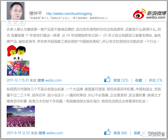 社會(huì )的進(jìn)步一直在更替信息交流的傳播方式,從面對面的口碑傳播到今天的互聯(lián)網(wǎng)信息傳播,從被動(dòng)傳播到主動(dòng)傳播,從他人傳播到自我傳播,傳播的技術(shù)手段一直在不斷更新中,而微博作為目前傳播速度最快、傳播范圍最廣、傳播成本最低的自媒體工具正被大眾所認知。作為企業(yè)主,尤其是一個(gè)成熟企業(yè)的企業(yè)主,無(wú)論再忙都不應該忽視企業(yè)的品牌建設,我平時(shí)在企業(yè)一般不管生產(chǎn),不管銷(xiāo)售,也不管人事,因為這些都已經(jīng)由更專(zhuān)業(yè)的下屬去管了,唯一我一直主管并參與的工作,就是品牌的傳播和企業(yè)的產(chǎn)品技術(shù)創(chuàng )新。而微博是企業(yè)的平民面包,誰(shuí)都能做,誰(shuí)都有機會(huì )到這個(gè)平臺上發(fā)布信息,誰(shuí)都有可能在微博上形成自己的圈子和互動(dòng)平臺,從而實(shí)現自己品牌在微博平臺上的不斷傳播。
